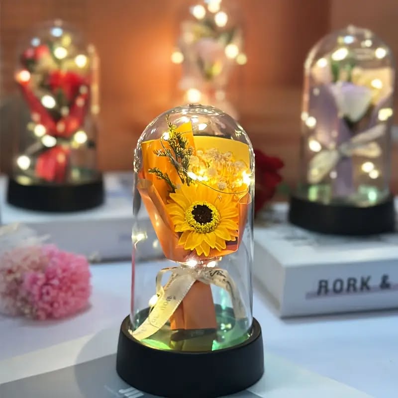 Girasol Eterno: Eterno capsulado es exactamente eso: una manifestación de cariño y amor que permanece protegida dentro de una cúpula de vidrio con luces LED, se transforma en un elemento decorativo singular que realza cualquier espacio.